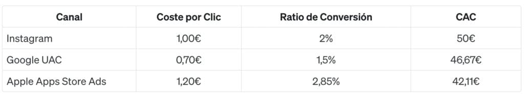 En el siguiente ejemplo vamos a suponer que hemos desarrollado una app y que ahora estamos realizando una inversión anuncios en diferentes plataformas digitales. Esta podría ser una instantánea de los gastos en marketing: