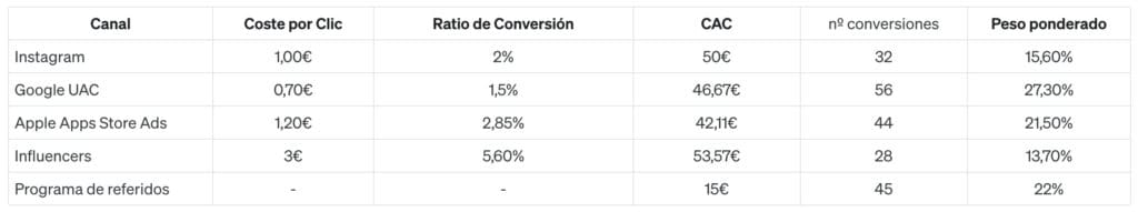 Ahora ya conocemos de forma aproximada cómo está rindiendo nuestro CAC por canal. Para mejorar este análisis, podemos añadir una media ponderada del CAC añadiendo el número total de usuarios que han convertido en cada canal. La ponderación nos ayuda porque podríamos, por ejemplo, tener un canal con un CAC alto y un bajo nivel de conversiones. Si todos los canales tuviesen el mismo peso, este canal con un CAC más alto y un bajo número de conversiones estaría distorsionando nuestro CAC medio. Y también podría ocurrir lo contrario, que un canal con un bajo coste de conversión y muchas conversiones se perdiese en medio del ruido.