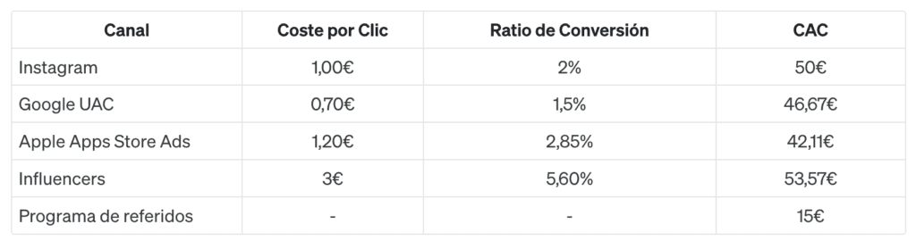 Por supuesto, cada una de estas plataformas nos proporcionará el CAC a nivel de campaña y anuncio. Así que daremos un paso más y añadiremos otros gastos de marketing y ventas menos evidentes. Digamos que hemos pagado 1.500€ a un influencer de nuestro nicho de mercado para que realizase algunas promociones a lo largo de 3 meses. El total, podemos atribuir 500 clics a esta campaña, por lo que al realizar la división de los 1.500€ entre 500 clics obtenemos un coste por clic de 3€. Sin embargo esos clics han sido muy efectivos, y de esos 500 clics convierte el 5,6% Una de las mejores y más asequibles para un CAC bajo son los programas de referidos, por lo tanto implementamos un programa de referidos en el que pagamos 10€ cada vez que un usuario referido se convierte en usuario de pago y al nuevo usuario le damos 5€ de crédito.