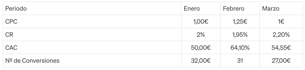 Si queremos detallar los datos de cada canal mensualmente, podemos pivotar esta tabla para tener un desglose mes-a-mes de las métricas del CAC. Por ejemplo, estos serían los datos para Instagram en el primer Cuatrimestre.