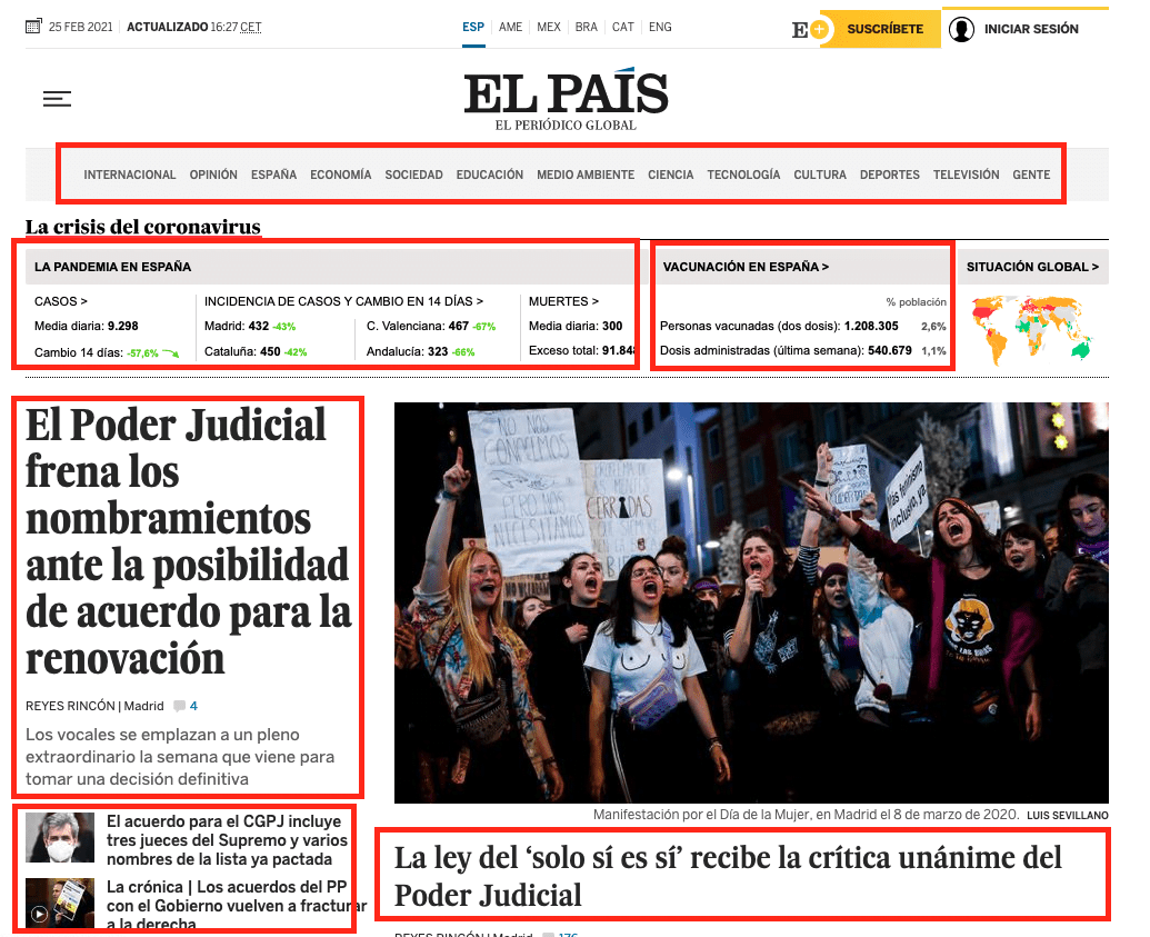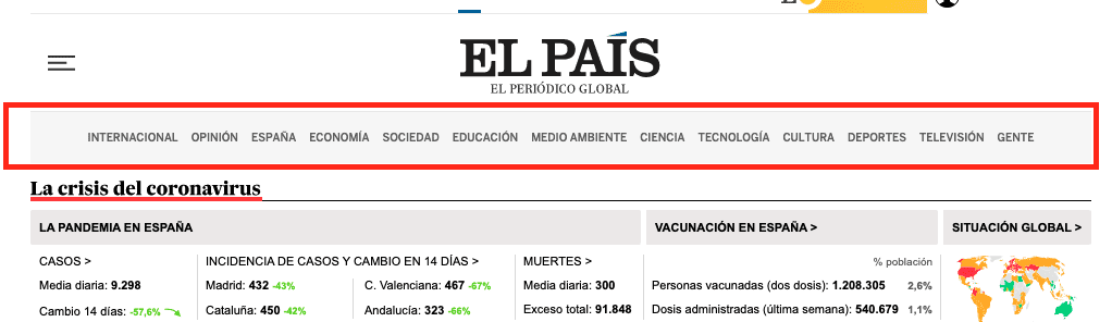 La mayoría de los periódicos online son puramente sitios basados en contenido en los que destaca la navegación jerárquica. Por ejemplo, si analizas la parte superior del website de un periódico, normalmente verás enlaces a las principales categorías de noticias en el menú de la cabecera.