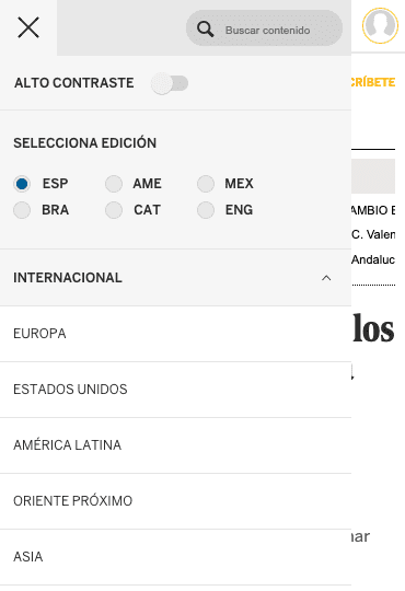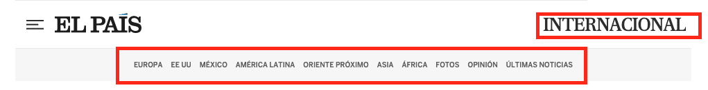 En la página de Internacional, no está el menú global, en su lugar se encuentran las diferentes subcategorías de Internacional.