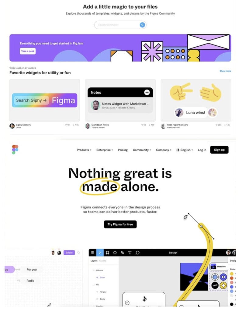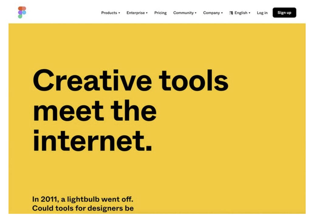 Figma es uno de los ejemplos más famosos del uso del nuevo brutalismo en el diseño web. Evita el uso de sombras en todas las imágenes, prefiriendo utilizar líneas negras más nítidas y oscuras que rodean las formas. El contraste en las tonalidades, como el naranja y el amarillo, destacan porque suponen un desafío para la vista.