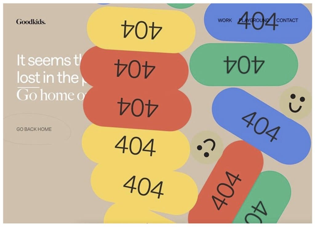 Nada más poner un pie en el sitio web de Goodkids, es imposible ignorar las enormes animaciones de 404 que se amontonan irregularmente para llenar la pantalla. Los emojis de caras sonrientes tienen un tono similar al fondo beige del sitio, lo que los hace ligeramente discordantes y por lo tanto llamativos.