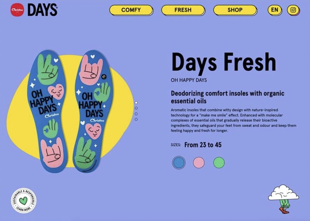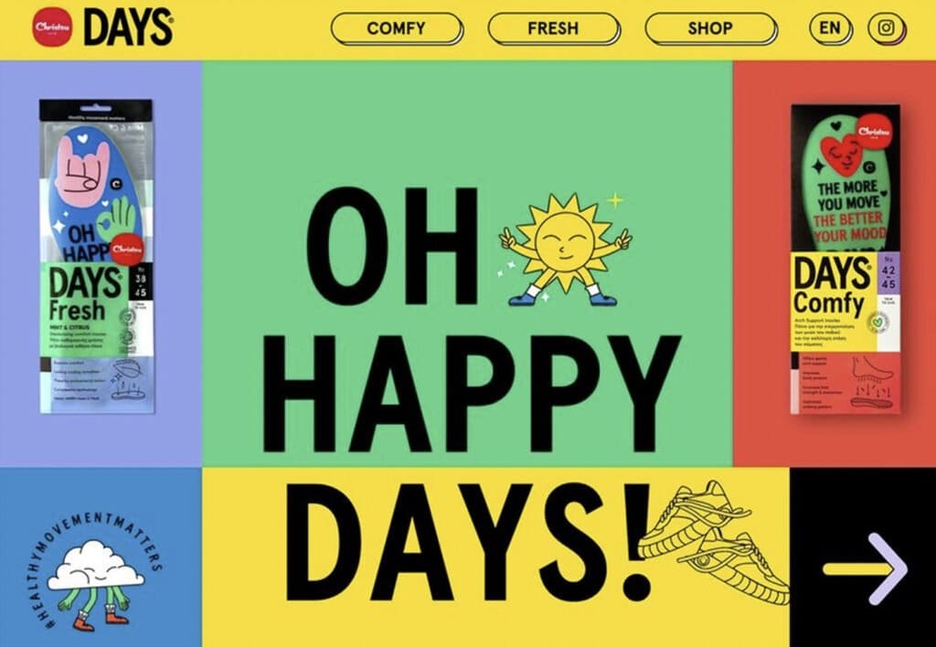 Fíjate en los colores apagados, sin degradados combinados con gruesos contornos negros. La tipografía es moderna y se lee fácilmente, algo que la diferencia de los estilos que se suelen utilizar en el brutalismo mucho más toscos. Las animaciones también contribuyen a modernizar el diseño brutalista.