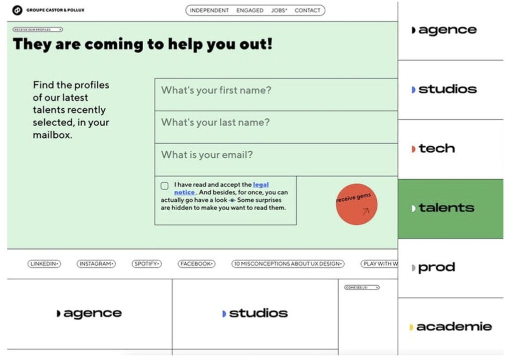 El sitio de Castor & Pollux, con mucho texto, está salpicado de color a medida que el usuario se desplaza. Incluso los botones para compartir en redes sociales evitan la iconografía clásica que cabría esperar en favor de una simple señalización de texto.